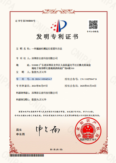 3月18日消息,深圳市安盈科技有限公司收到由中華人民共和國國家知識(shí)產(chǎn)權(quán)局頒發(fā)的一項(xiàng)《發(fā)明專利證書》,安盈科技自主研發(fā)的漏油監(jiān)測系統(tǒng)——“一種漏油檢測定位裝置和方法”榮獲國家發(fā)明專利,專利號:ZL 2024 1 0554214.7。這一成果標(biāo)志著安盈科技在工業(yè)安全監(jiān)測技術(shù)領(lǐng)域的領(lǐng)先地位,也為行業(yè)漏液監(jiān)測提供了創(chuàng)新解決方案。...
